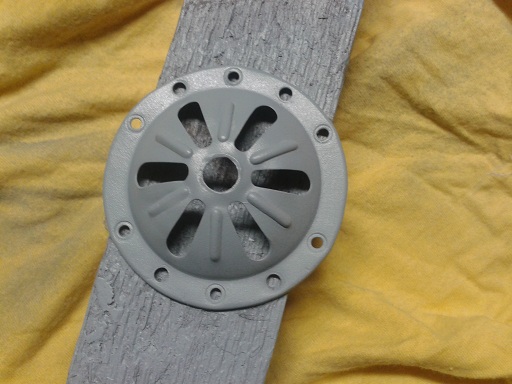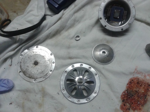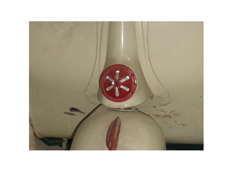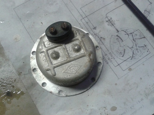 ho anche messo mano al clacson dopo sverniciato la griglia e aperto (con un trapano ho fatto fuori gli occhielli di fermo), ho spazzolato la coppetta e zincato (con spray) il piattello, poi ribattuta la griglia con un martelleto da carrozziere per eliminare le imperfezioni...altrimenti avrei mantenuto il rivetto centrale)e dato sulla griglia l'aggrappante per alluminio e il fondo grigio. Mi metterò alla ricerca dell'occhiello (o rivetto?) centrale (per i laterali devo ringraziare bepo che me li ha gentilmente mandati... qui a ferrara i calzolai come è noto vendono schede telefoniche o rifanno chiavi), poi vernicerò in nero la griglia farò con della carta oleata la guarnizione fra cicalino e piattello (che si deve muovere quindi niente silicone)... come era d'altronde in origine