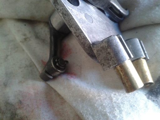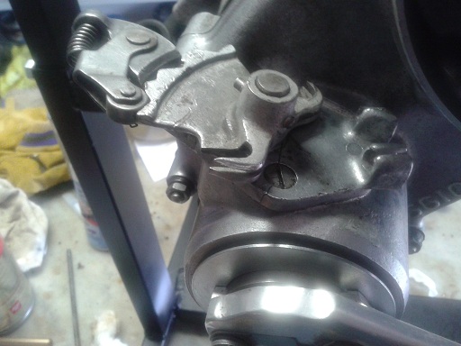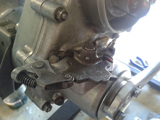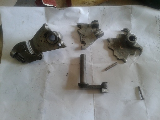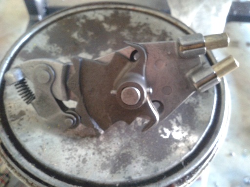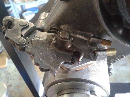 Ho trovato la flangia del selettore (a peso d'oro 30 euro!!!), pulito tutti i pezzi, ho iniziato il montaggio del selettore. Messo un pò di grasso nel selettore con gli innesti, ho trovato un gioco tra la leva selettore e il pattino...questa tolleranza sommata al consumo della crociera e all'aumento della tolleranza del cambio potrebbe portare a far saltare la marcia. Quindi ho messo una rondella e cambiato al coppiglia sulla leva e poi ho inserito la leva nella flangia di alluminio, poi selettore e leva collegate dalla spina conica (messa da dietro in avanti con un martellino) tiene poi la levetta in posizione obbligata. Quindi perno fissa staffa alla flangia con relativa coppiglia, caricata la molla (che non permette l'uscita della marcia... anni 50 che tempi!!!). Infine messi i 2 due capocorda di ottone
