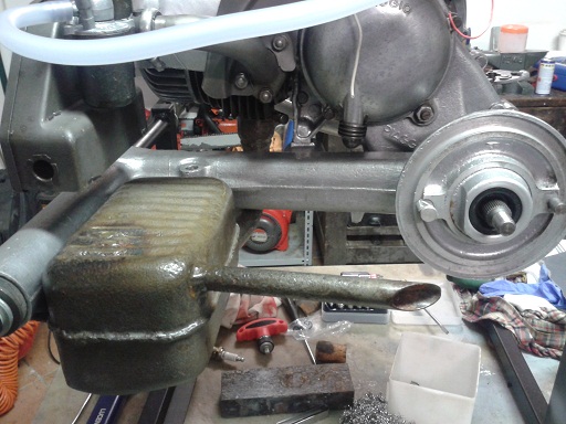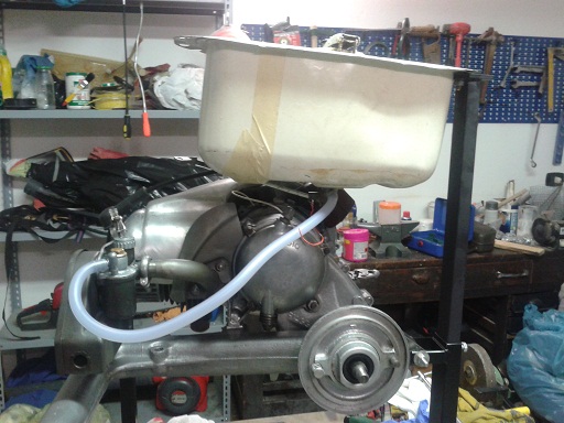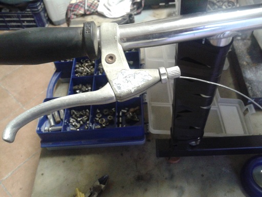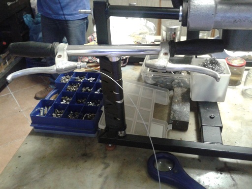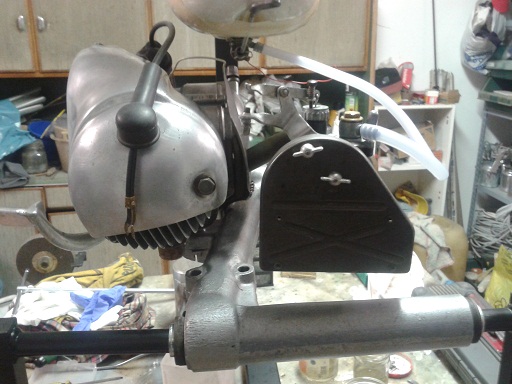oggi nel tardo pomeriggio e grazie a stefano abbiamo montato una candela marelli d'epoca (spazzolata e fa la scintilla), messo l'olio cambio, montato un manubrio da bici sul cavalletto e collegata una leva con la frizione ... perfettamente funzionante e con le marce che entrano bene ... sabato si mette in moto