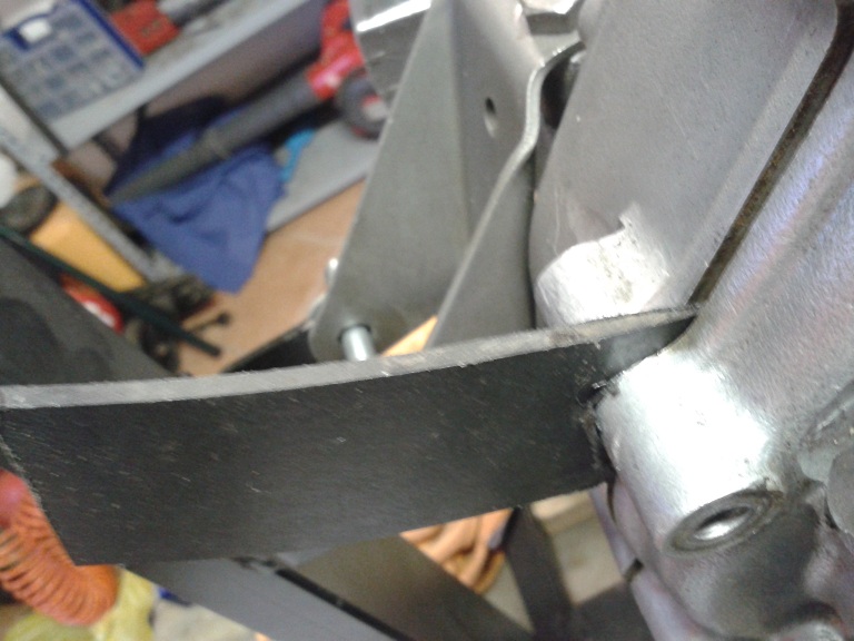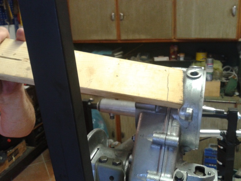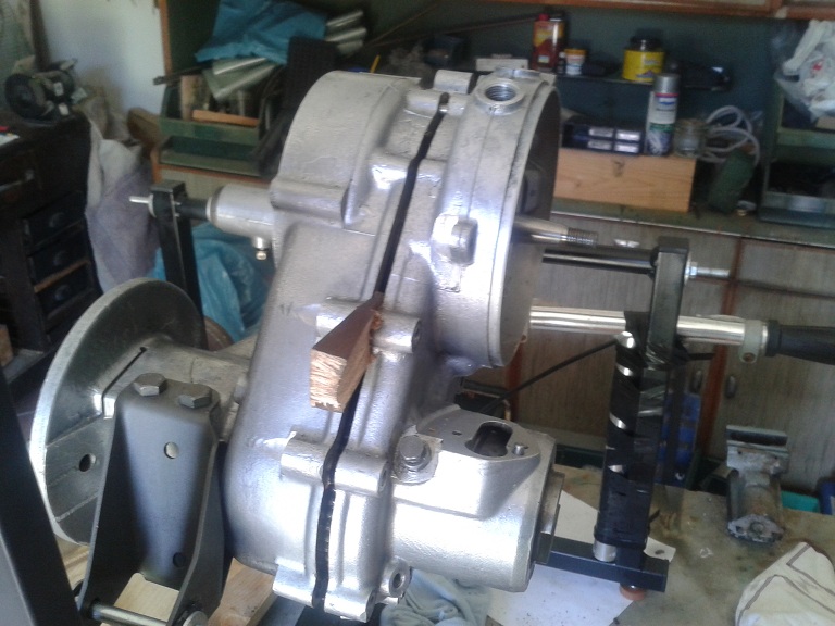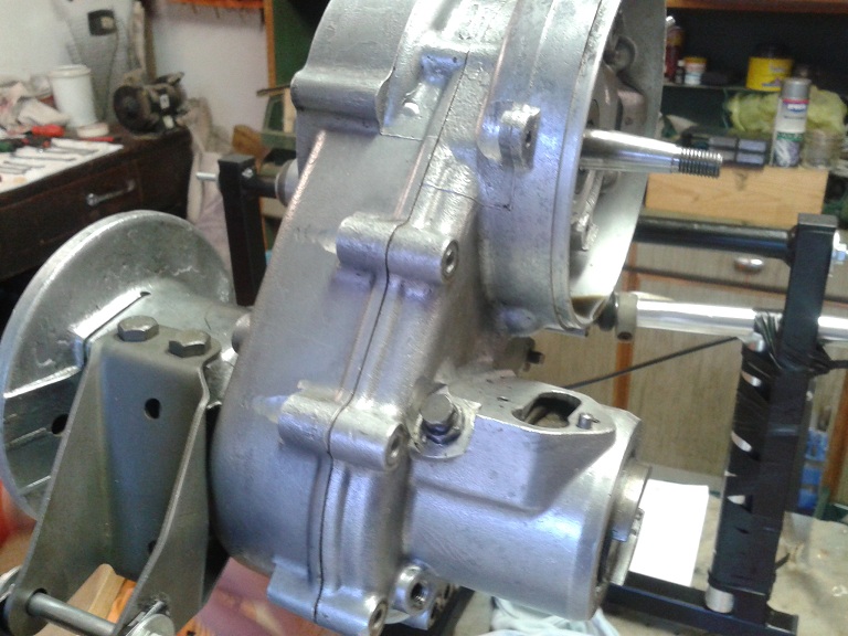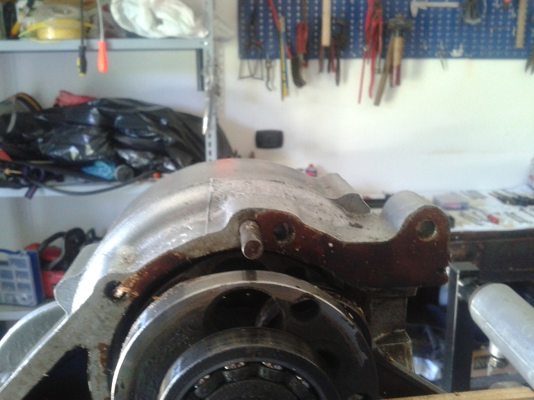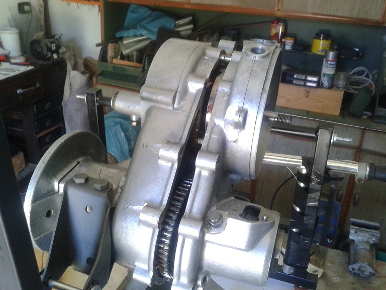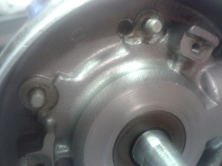 dopo questi preliminari ho iniziato a smontare il carter A) svitato gli 8 dadi di bloccaggio del bulloni del carter (chiave 11), recuperate le rondelle piane ed elastiche e rimosso i bulloni (che hanno tutti la stessa altezza quindi è inutile numerarli), tranne uno rimasto in sede perchè impedito dalla traversa motore B) allargati i lembi delle rondelle di freno in ottone dei 4 dadi ciechi situati nell'alloggiamento del disco supporto bobine; svitati io 4 dadi, recuperate le rondelle di fermo e sfilati (dal lato frizione) solo i 2 bulloni in alto (i 2 in basso potranno essere sfilati solo dopo la rimozione del parastrappi) C) non vanno rimossi i 2 spinotti (sopra l'albero motore e sotto la alloggiamento crocera) fra i semicarter (penultima e terzultima foto), nè il bullone con controdado dei fermo della messa in moto D) messe delle zeppe (la prima più sottile di plastica e le altre di legno, va bene quello delle doghe delle sedie)e pian pianino ho separato i 2 semicarter, usando anche un asse di legno con mazzetta a testa di plastica, tirando alla fine con le mani il semicarter lato volano e lasciando sul cavalletto il semicarter lato frizione