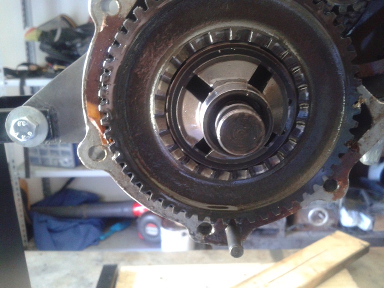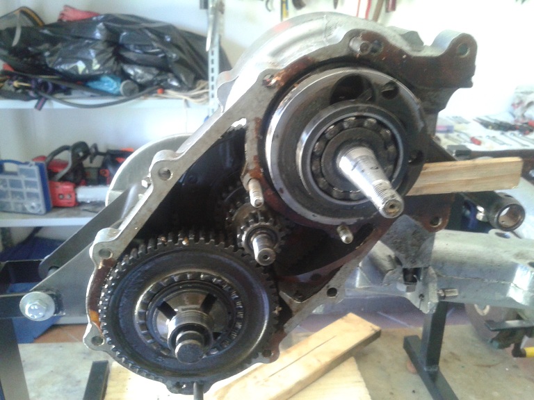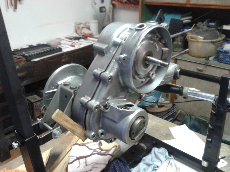 oggi ho aperto il carter come da MO ho seguito questo ordine: preliminari A) staccato cavo candela, rimossa candela e presa AT, carburatore, collettore e marmitta B) levata cuffia di raffreddamento svitando il bullone sulla testa e la vite fissaggio sulla chiocciola C) rimosso coperchio chiocciola (viti), ventola(bulloncini) e volano (con il seger montato come estrattore) D) rimosso la chiocciola (3 viti di diversa lunghezza), presa BT e supporto bobine (3 viti) segnando sul piatto supporto bobine e sull'alloggiamento carter la posizione E) smontato testa e cilindro (3 dati sui prigionieri), rimosse molle di fermo dello spinotto con pinza a becco acuto con rotazione oraria della molla tirando contemporaneamente all'esterno, e successiva rimozione dello spinotto all'esterno con matita (si, quella da disegno) ma se è duro si può usare un tondino metallico di opportuno diametro F) rimosso settore di comando cambio (ne ho già parlato prima), e leva pedivella messa in moto G) rimossa frizione con apposito estrattore e usando un grosso cacciavite nella feritoia più esterna della scatola frizione per non farla muovere e così poter svitare il dado centrale
