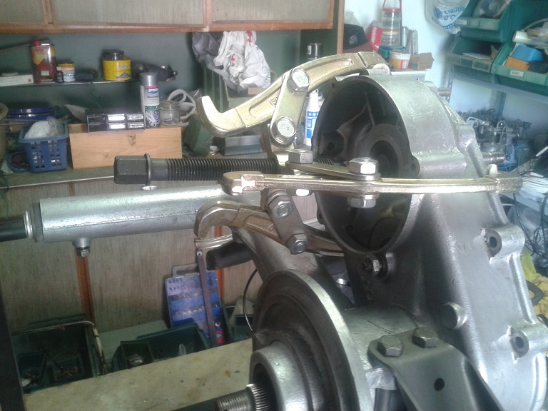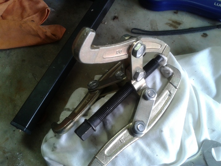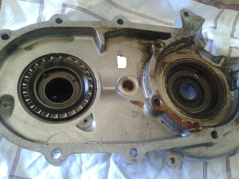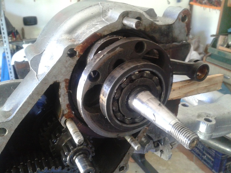 quindi tranne il boccolo della messa in moto rimasto sul semicarter volano, tutto il resto è rimasto attaccato al semicarter lato frizione. Per rimuovere l'albero motore ho usato un estrattore a tre bracci che avevo in officina mettendo dei feltrini sulle griffe per non rigare il carter. Dopo un clac (uscita del cuscinetto dal suo allopggio nel semicarter lato frizione) è uscito tutto facilmente (senza scaldare o comprare il costosissimo estrattore piaggio)con i 2 cuscinetti rimasti attaccati all'albero motore....ma poi vedremo di levarli...