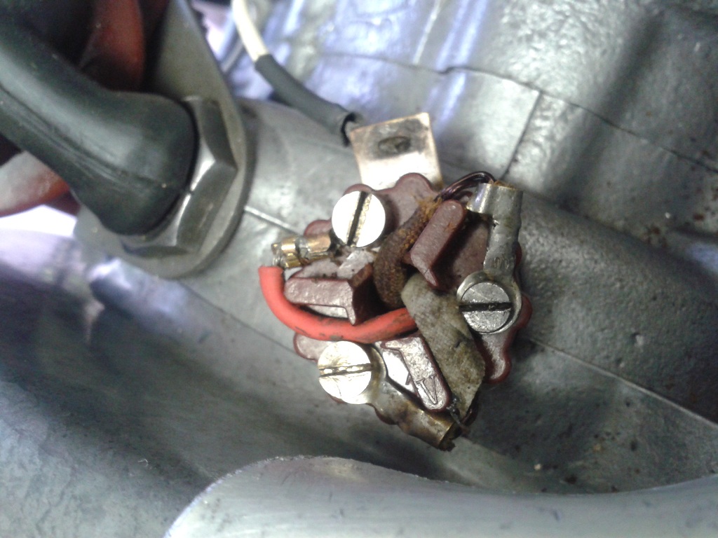 il motore l'ho fatto partite con la seconda pedalata, poi dopo 10 secondi si è spento e non è arrivata più corrente alla candela ho dovuto smontare lo statore, controllare i fili delle bobine, rimettere puntine nuove d'epoca (con la molla doppia - 8 euro al mercatino del 25 aprile a ferrara), aprire la bobina alta tensione e lì riavvitando i dadi (mai usare la chiave ma solo il cacciavite) è avvenuto il fattaccio (per modo di dire)... ho tranciato il bulloncino cavo di ottone che è rimasto dentro il dado non volendo mettermi alla ricerca di un coperchio nuovo (15 euro ma non di bachelite... altrimenti 45 euro mezzo rotto o 100 tutto il pezzo... siamo veramente fuori) ho proceduto come segue (non ho fatto ahimè foto per l'incazzatura ma forse ho rimediato)... ho proceduto come segue ... e potrà forse servire a qualcuno