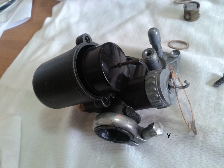 poi G) dopo ave r levato la leva a bilancere A, si svita il coperchio della camera miscela B e si svita la vite guida W della saracinesca cilindrica I H) si estrae quindi con il cpoperchio B il complesso (C > L) molla-ghigliottina cilindrica (valvola gas)-spillo conico I) si raddrizza leggermente con una pinzetta il gangio dell'astina F(in questo modo viene più facilmente fuori dal coperchio) e poi si porta via il coperchio B, la guarnizione nera C dell'astina F e il fondello di ritenuta della guarnizione D (parte concava verso il coperchio e pista verso la molla) e poi la molla E L) quindi con una chiave a tubo da 9 si svita il nipplo a vite G che permette di liberare l'astina a gangio F M) si sfila poi dall'alto lo spillo conico H (su cui è inciso la misura 4) con il suo seger di fermo e lo si libera dalla saracinesca cilindrica I N) si leva il seger di fermo dallo spillo conico (normalmente è messo alla seconda scanalatura delle tre che ci sono e che servono per modificare la carburazione) O) si leva poi dal corpo del carburatore con una chiave a tubo da 9 il polverizzatore con getto del minimo L P) si leva infine il getto del massimo (misura 83) M con una chiave da 10 quindi si lava con benzina e si controlla il tutto