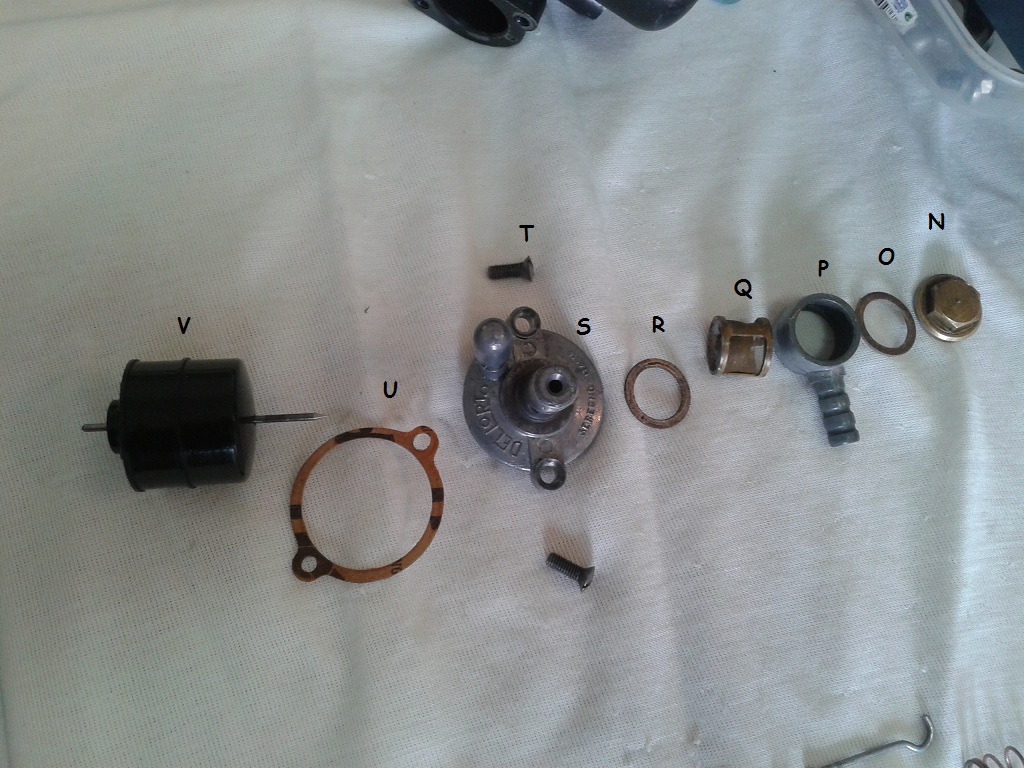 A) si chiude il rubinetto e si leva il tubo della miscela B) si leva filtro dell'aria svitando i due dadi ad aletta C) si svita il bulloncino (Y) del collare che fissa il carburatore al manicotto, e poi ruotando a destra e sinistra il carburatore lo si sfila dal manicotto D) con una chiave da 14 si svita il tappo pipetta N, la guarnizione O, la pipetta di arrivo miscela P, il filtro benzina Q e la seconda guarnizione R E) si toglie il coperchio del galleggiante S con il suo cicchetto svitando le 2 viti T e si leva la sua guarnizione U F) si rimuove il galleggiante di 7.5 g V con la sua astina e l'anello di ritenuta (che va nel solco dell'astina e la tiene in sede)