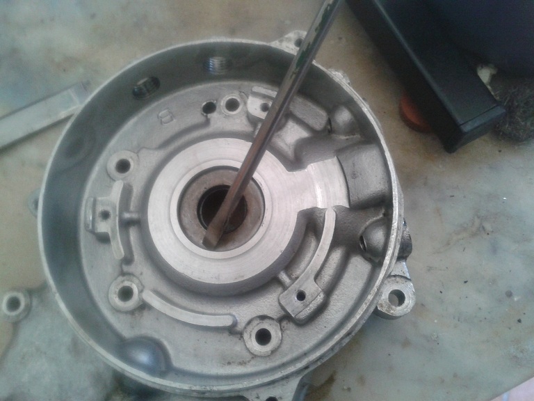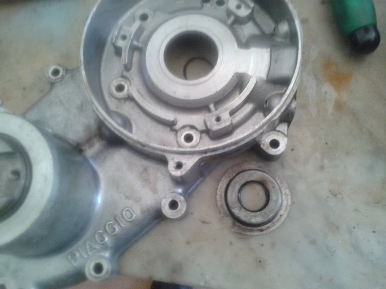 per finire ho tirato fuori il boccolo della mesa in moto - prima levando il seeger per il boccolo (nella parte interna del carter) - poi levando il bullone con controdadio di fermo della messa in moto - quindi con una mazzetta di gomma (battendo dalla parte esterna del carter) spingendo fuori il boccolo in ghisa porta leva di avviamento con il suo oring cristallizzato