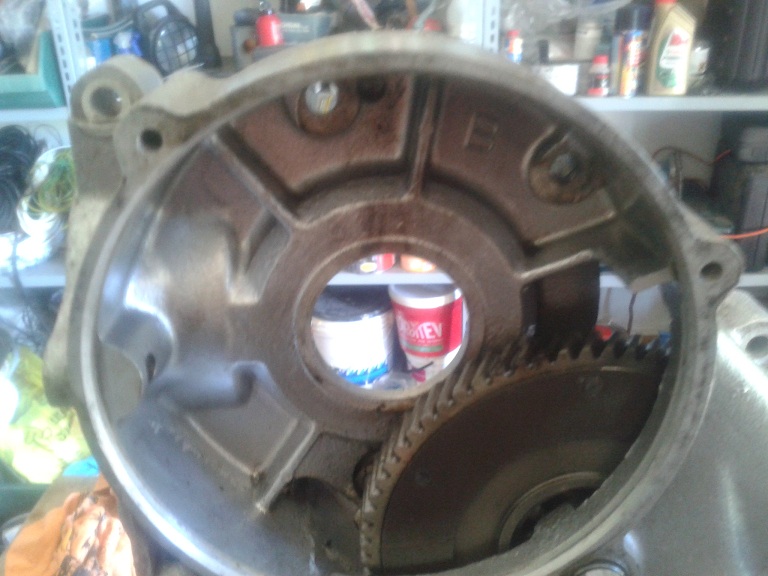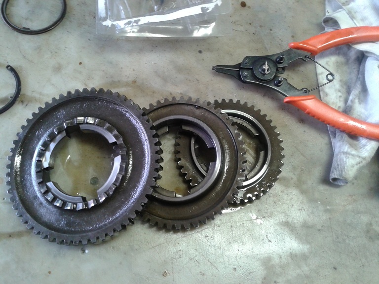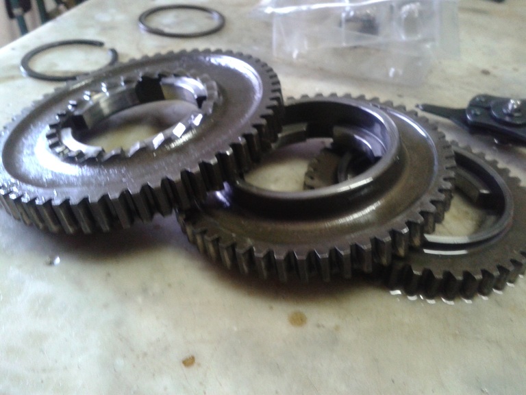 nel tardo pomeriggio sono andato avanti con lo smontaggio tirato via il seeger, l'anello di spallamento e i 3 ingranaggi cambio...denti a posto