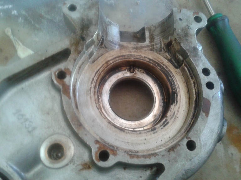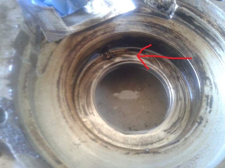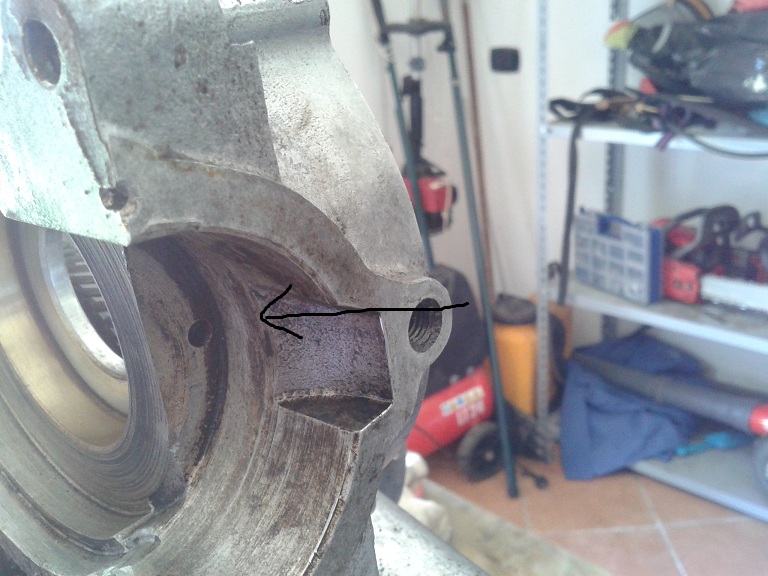 Da notare che i 2 paraoli sulla flangia presentano un incavo (quadrato o rotondo non ha molta importanza) e nella fase di montaggio questo incavo va orientato verso in foro presente nell'alloggiamento paraolio/cuscinetto del carter. Questo per integrare la lubrificazione dei 2 cuscinetti di banco mediante l'olio contenuto nella miscela, e quindi è stato fatto nel carter un foro passante (vedi foto) in modo che una parte della miscela arrivi alla camera di precompressione passando attraverso i cuscinetti