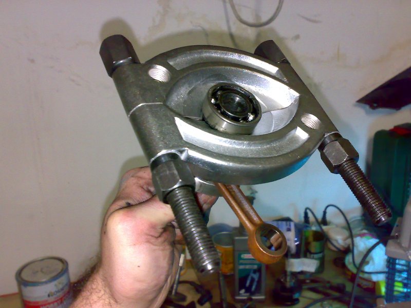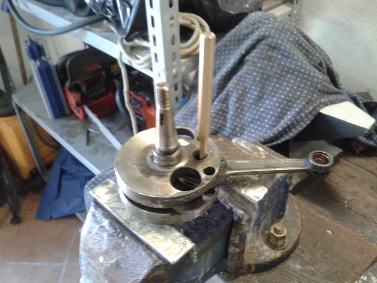 per l'altro cuscinetto ho usato il metodo di mimmo: ho prima però scaldato per 1 minuto e mezzo il cuscinetto, messo poi a battuta il contrappeso sulla morsa, infilato nello spinotto della testa di biella un cacciaspine da 9 e battuto (la forza va solo sul cuscinetto e non sull'albero) e ho battuto anche negli altri 2 fori del contrappeso dell'albero che mi permettevano di andare sul cuscinetto uscito in fretta