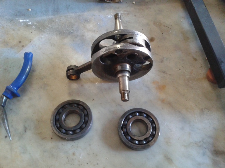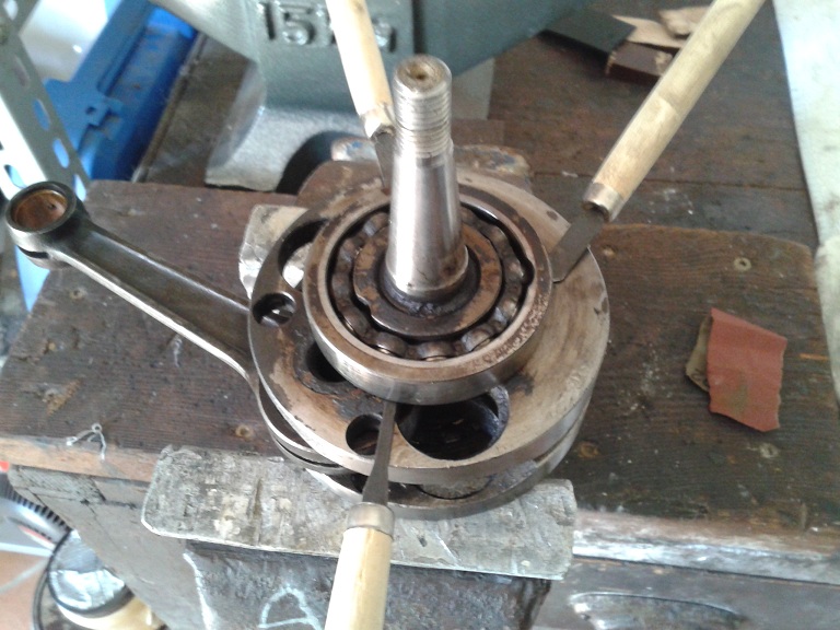 ho messo sotto il cuscinetto (0.65 mm) degli scalpellini metallici per tenerlo sollevato, quindi scaldato per 1 minuto e mezzo prima il cuscinetto (specie l'anello interno) del lato volano (mi era più comodo per mettere in morsa l'altro ciuscinetto per via dell'albero volano più lungo che interferiva con la base della morsa, poi messo degli scalpellini tutto intorno e 2 cacciaviti grandi (battendo pian piano con una mazzetta di gomma) e non ho avuto eccessivi problemi