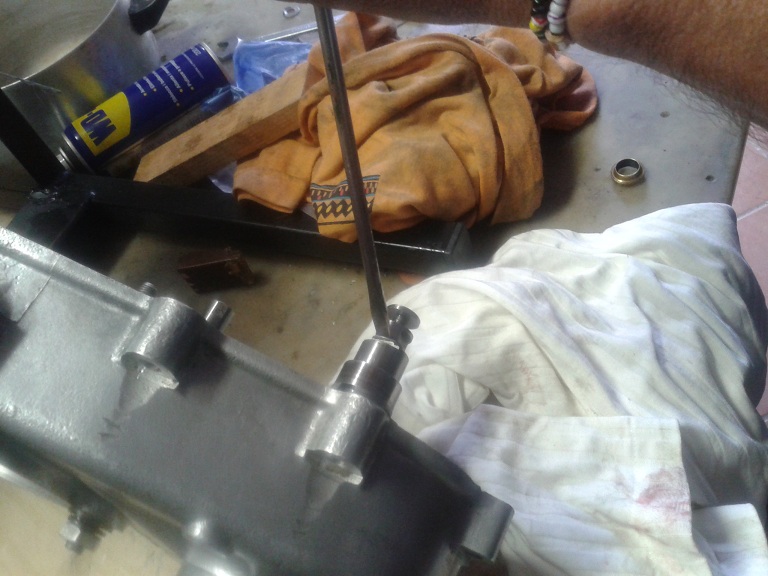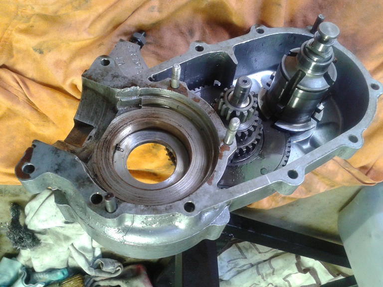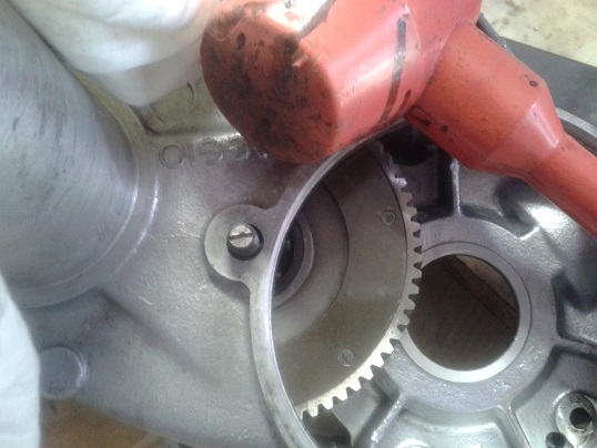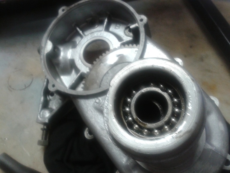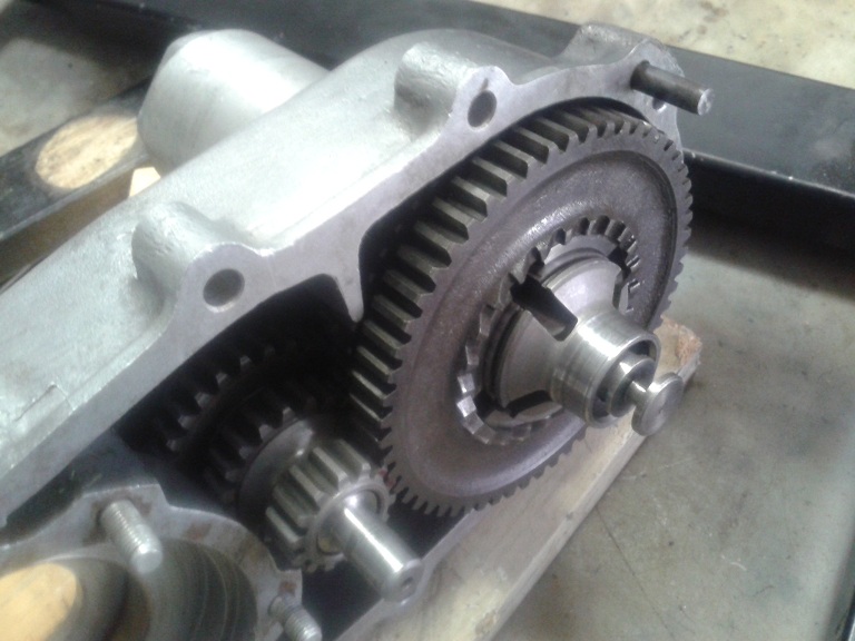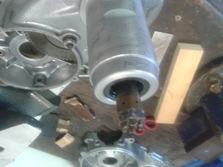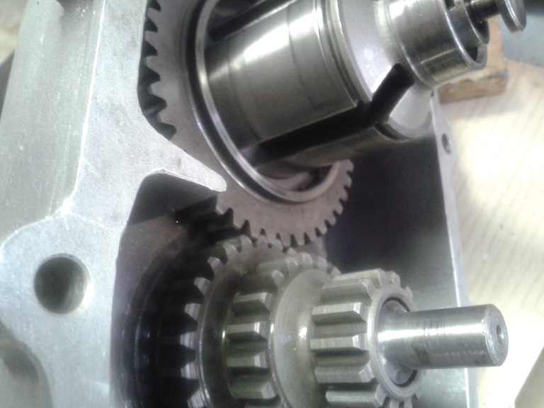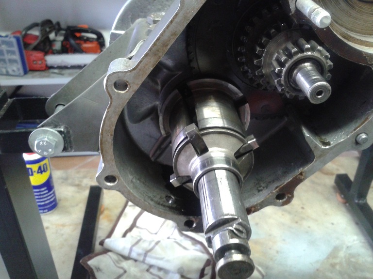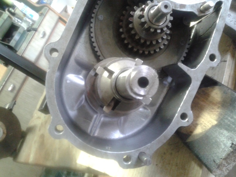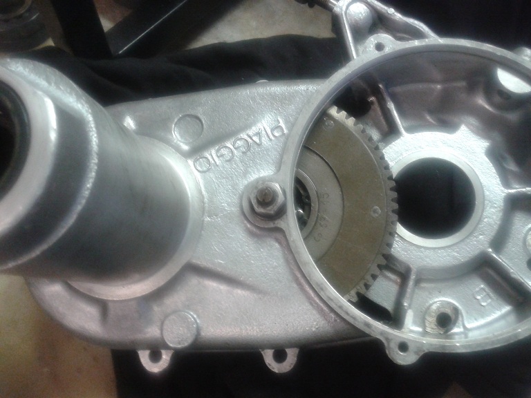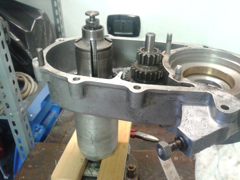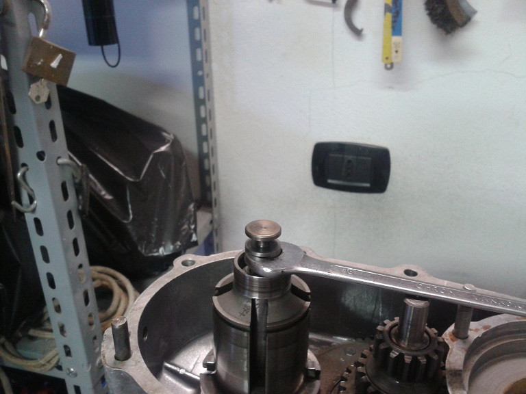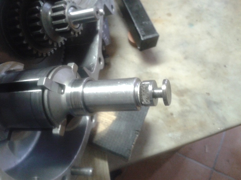 Quindi, dopo aver visto che i 2 cuscinetti erano integri, ho montato l'albero sul semicarter ingrassando la parte col millerighe e usando una mazzettina di gomma (avendo cura di mettere la feritoia più lunga rivolta verso il parastrappi) ... ho messo l'ingranaggio piccolo delle marce sull'albero ma non era in giusta presa con la dentatura del parastrappi, quindi ho tirato ulteriormente fuori l'albero dal semicarter usando delle rondellone e spessori e avvitando il dado dell'estremità ruota... e così tutto è tornato a posto con giusta contrapposizione dei denti del cambio e dell'albero di natale (albero primario). I due ingranaggi marce interni sono stati messi con la parte sporgente verso l'alto (cioè verso l'interno carter) e l'ultimo con la parte dentellata sempre verso l'interno carter. Quindi ho messo l'anello di spallamento e il seger, controllando poi che il gioco assiale complessivo degli ingranaggi fosse inferiore a 0.30 mm (pena il montaggio di un anello di spallamento maggiorato)