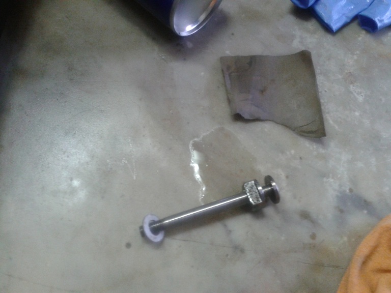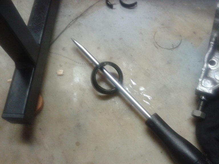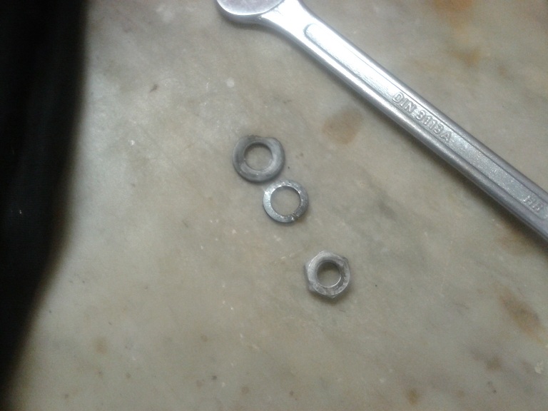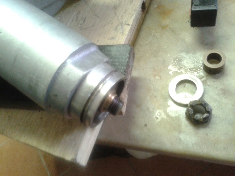 Quindi ho infilato lo stelo con una rondella nuova avvitandolo in senso antiorario (filettatura sinistrorsa) nel foro filettato al centro della crocera Dopo aver avvitato lo stelo ho ripiegato con un cacciavite e martello i bordi liberi della rondella (di fermo) su una delle 2 spianature dello stelo e sulla spianatura del manicotto