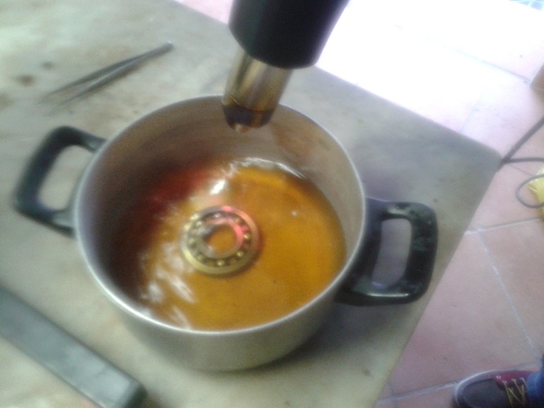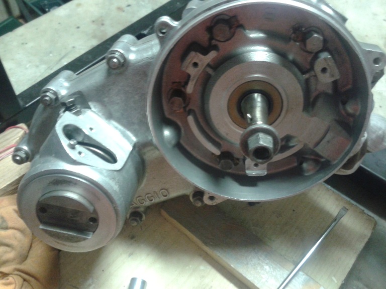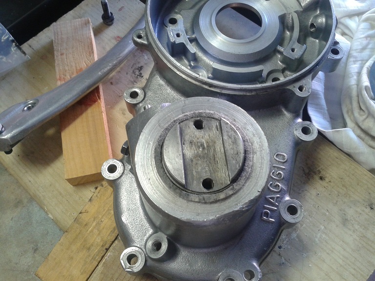 per montare sul carter invece l'albero motore lato frizione ho provveduto a scaldare con un phon la sede per circa 1 minuto e mezzo, messo il paraolio ingrassato con l'incavo verso il foro di lubrificazione di cui abbiamo parlato in precedenza, messo sopra un rondellone e battuto con un pezzo di legno, poi levato il rondellone e messo l'albero... il cui cuscinetto è andato a battuta con un piccolo colpo di mazzetta... nessun apparente stress per il paraolio i cui lembi interni non sono stati danneggiati dal gradino dell'albero che è entrato come l'olio... non ho usato le guaine di ferro (vedi foto) del MO Piaggio (potete usare vecchie pallottole svuotate di calibro opportuno) non ho messo l'albero in freezer