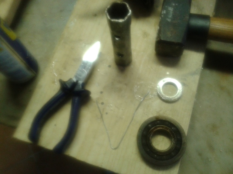 poi è stata la volta del montaggio dei 2 cuscinetti sull'albero motore... - ho scaldato i cuscinetti nell'olio motore (con il phon) per circa 6 minuti a 80/100 gradi (ho usato un vecchio termometro da 100 gradi che non pensavo mai di usare nella vita) - ho messo una rondellona come zeppa (vedi freccia nella foto) tra i semialberi - ho messo una spalla (contrappeso) appoggiata sulla morsa (o meglio sugli angolari di alluminio della morsa) - ho messo una graffetta sulla spalla superiore per fare spessore messo il cuscinetto nuovo scaldato, sopra un anello di misura simile all'anello interno del cuscinetto, un vecchio cuscinetto, una chiave a tubo e con un paio di colpetti della mazzetta di ferro tutto è andato a posto (molto facilmente) - ho poi levato la graffetta che mi ha dato uno spazio di circa 0.7/0.8 mm fra la spalla e il cuscinetto (utile se si dovrà in futuro levare il cuscinetto per mettere il separatore)