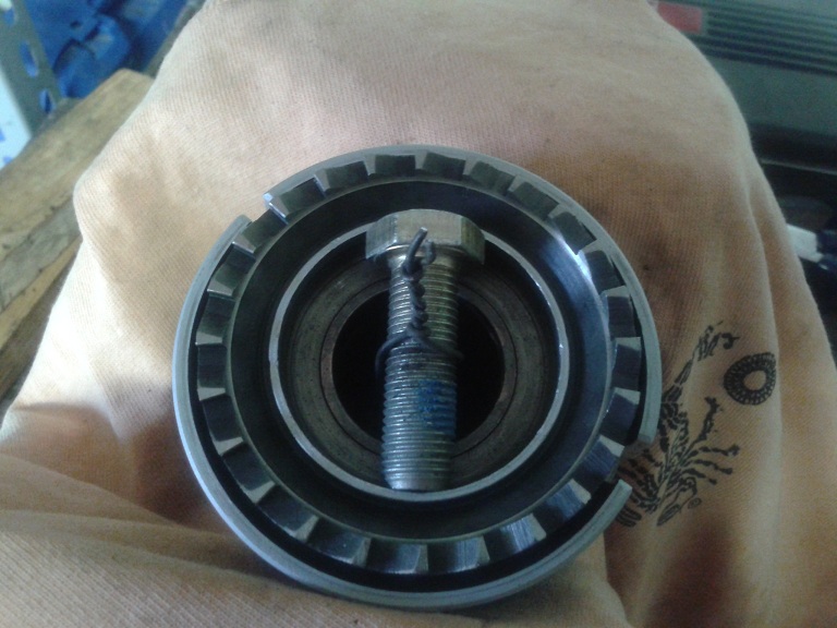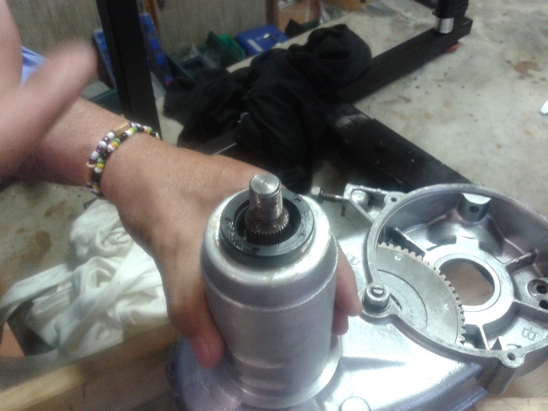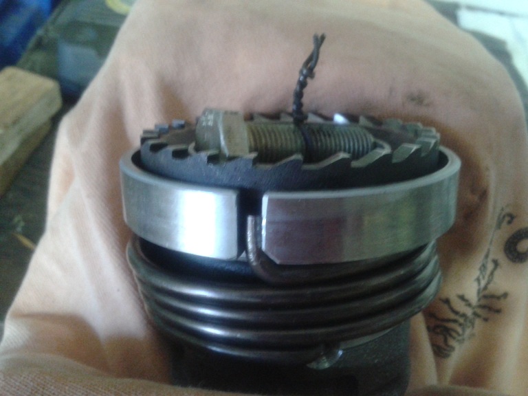 tenere con la mano premuto il boccolo dentato sul boccolo di messa in moto e mettere un bullone su cui arrotolare il filo fi ferro per non far disassemblare il tutto