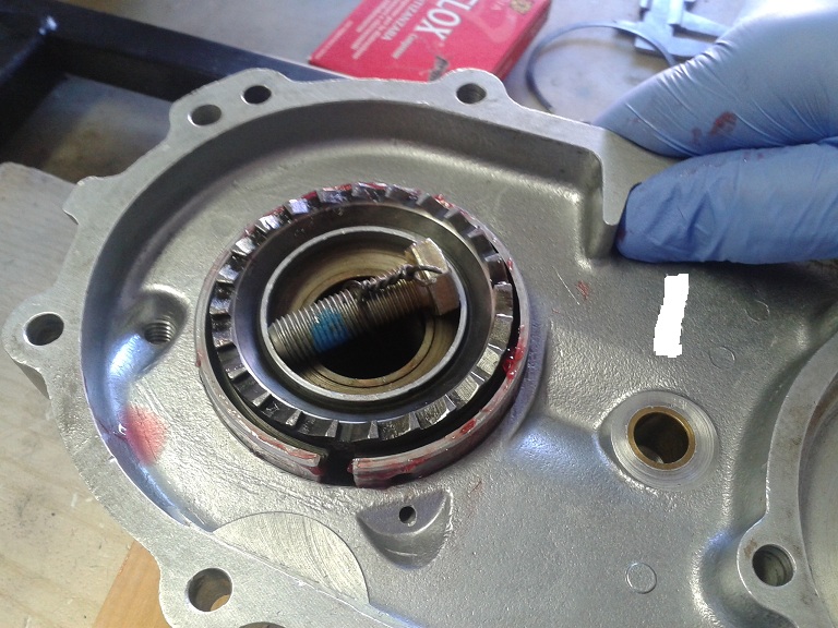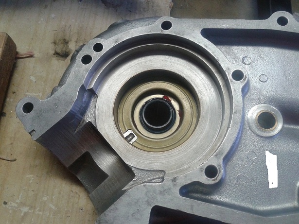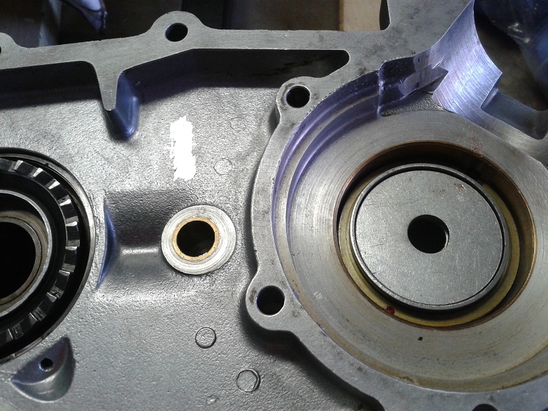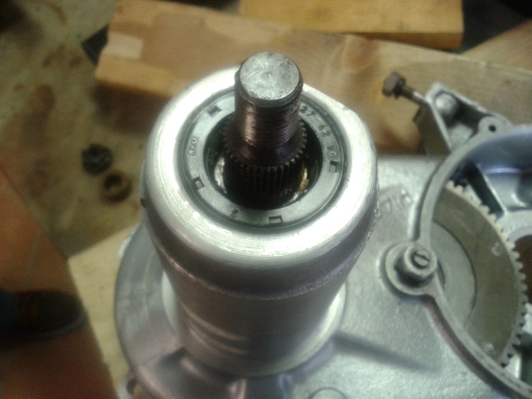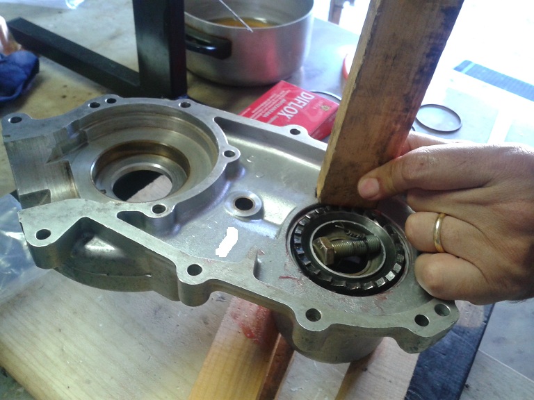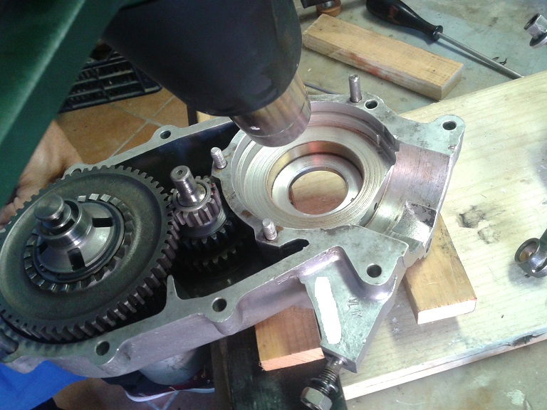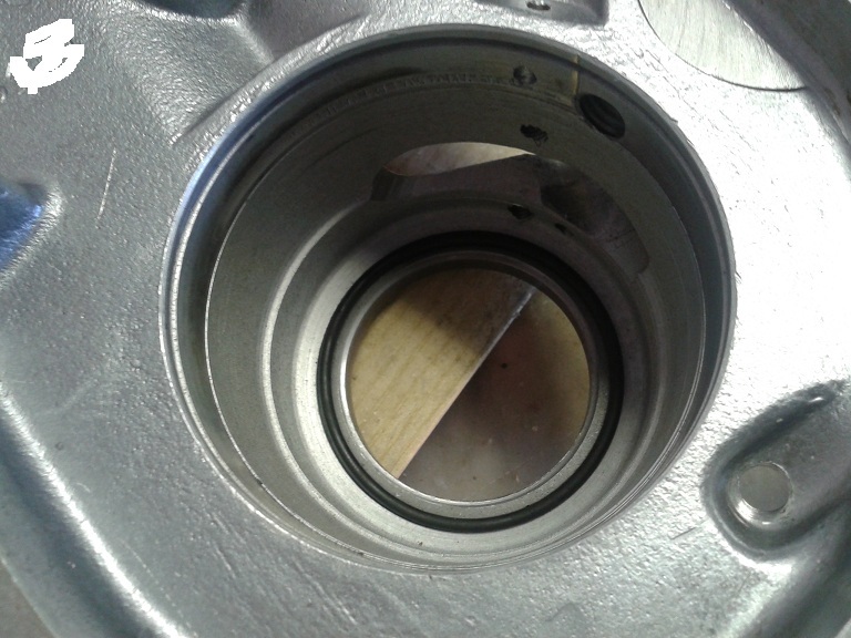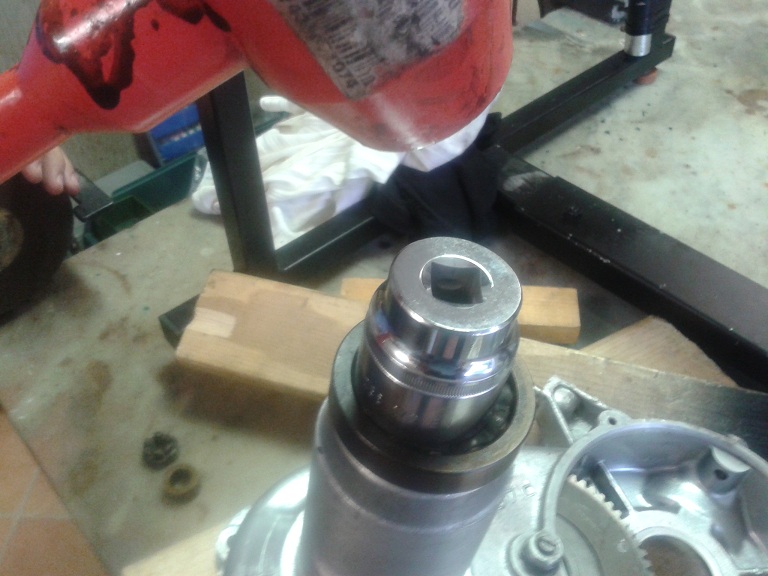 E' stata poi la volta del montaggio del paraolio dell'albero ingranaggi ... usando grasso, rondella, vecchio cuscinetto e bussola con la solita mazzetta di gomma è andato dentro dritto, bene e facilmente