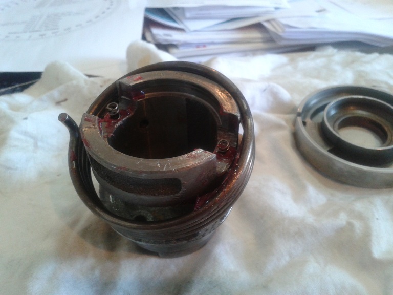 rovesciare il boccolo di messa in moto sul tavolo e mettere nei 2 fori le 2 mollette di spinta tenendole in sede con del grasso
