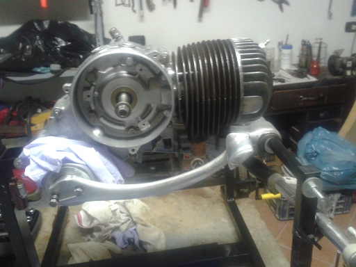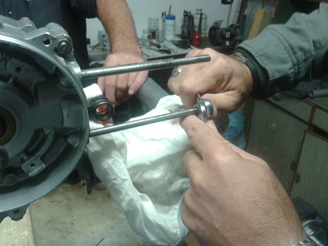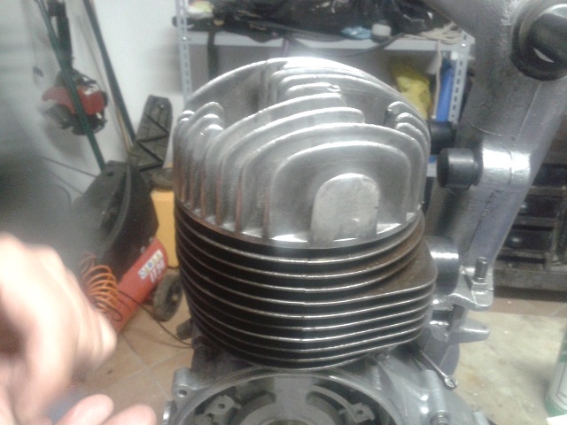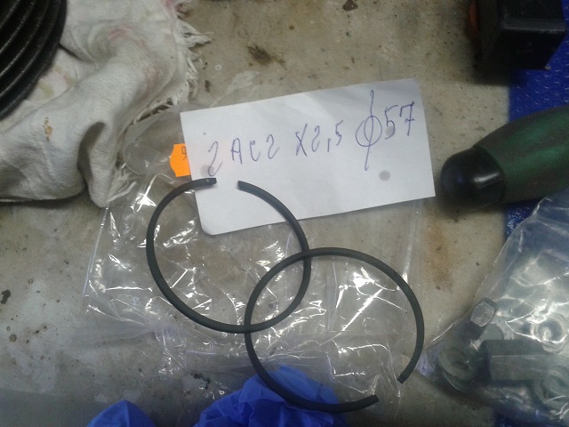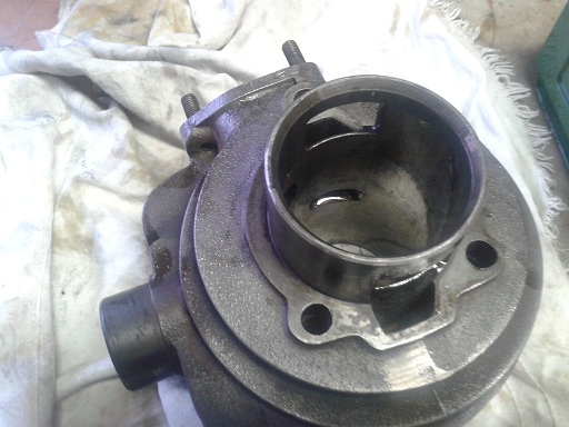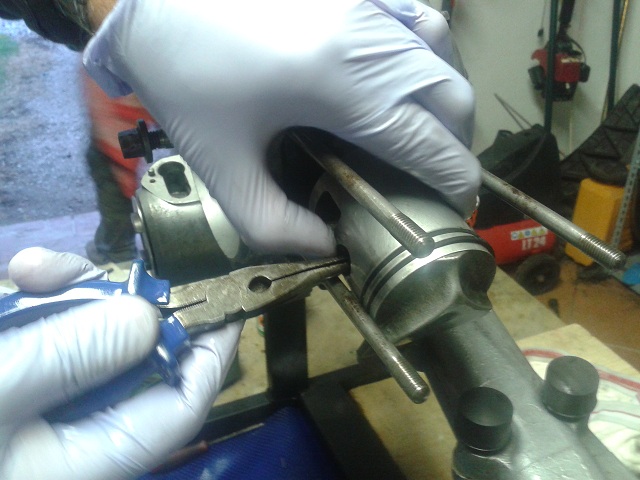 oggi finalmente ho montato il GT prima sono stati messi i 3 prigionieri e stretti con dado e controdado poi, dopo aver lucidato un pò il pistone con carta 1000 e acqua (per levare i segni della scaldata presa per colpa dei paraoli rotti), messe 2 fasce nuove stando attenti a metterle nel verso giusto (bisogna quindi considerare i 2 grani posti nelle 2 piste del pistone), poi messo lo spinotto (va dentro con le dita) e i 2 anelli di fermo con le pinzette a punta nel piede di biella per montare il pistone (nella foto quello originale a cappello dei prete... per giunta non maggiorato)... tenendo conto del giusto orientamento del pistone. Infine messo il cilindro con la sua guarnizione di carta verso il basso e di rame verso la testa, la testa e le 2 rondelle piane con rispettivi seger e dadi...mentre nel terzo buco dove va il distanziale per la cuffia va solo una rondella piana (senza seger) e il dado più basso degli altri 2. Messa poi la pedivella e dati 2 colpetti per vedere lo scorrimento del pistone nel cilindro
