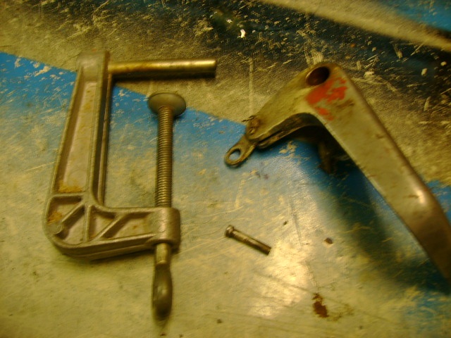 anche oggi al lavoro... tirato giù il motore dalla vespa (ci sono 2 bulloni e non uno)dopo aver levato il carburatore e i cofani e l'ammortizzatore posteriore. Problemi a levare lo spinotto del pedale freno (malgrado CRC ecc) ...ho risolto con un morsetto (senza forare la pedana)e facendolo uscire dalla feritoia che si vede sul pedale