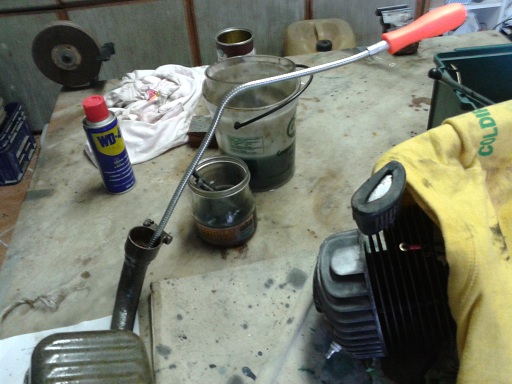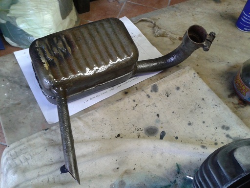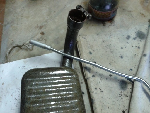 e per ultimo saldato la marmitta (che aveva dei fori), passata con impregnante per legno (o coppale come dir si voglia) e poi dopo averla lavata internamente, asciugata e scrollata (era già stata cotta sul fuoco e sabbiata - vedi qualche post in alto) ho levato i resuidui ferrosi interni con la calamita a tubo flessibile inserita nei 2 buchi (è uscita tanta di quella roba)ed ora scrollandola non fa più rumore. La calamita si trova dal brico/self a 2 euro nelle bancarelle delle offerte speciali di solito poste all'entrata