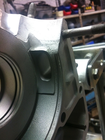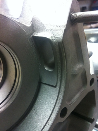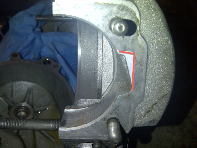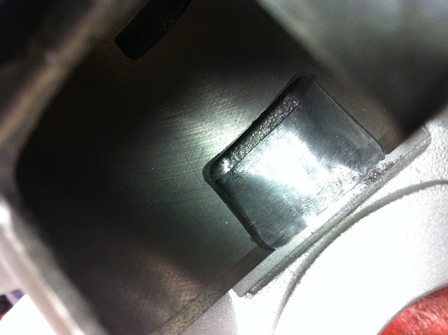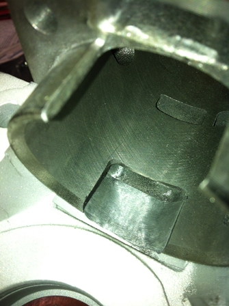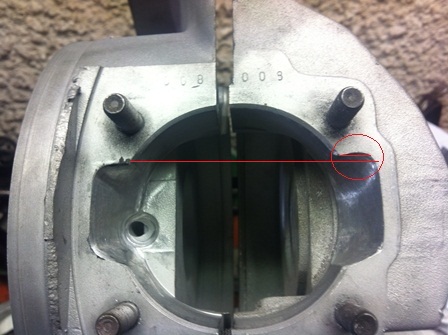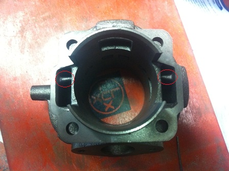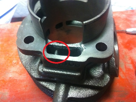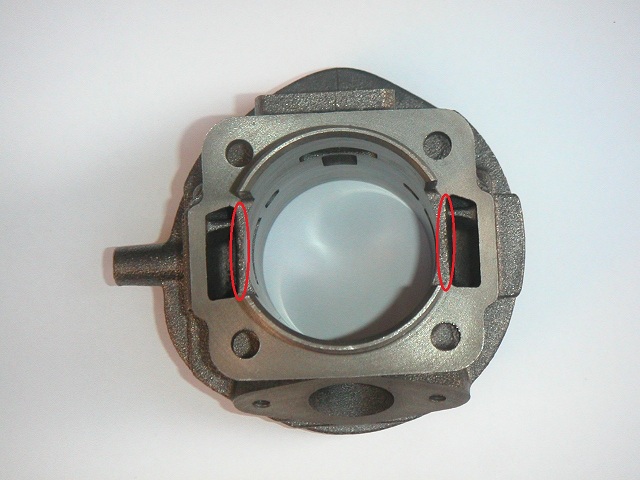 Riguardo all'argomento "travasi" e dintorni, non è necessario assolutamente riportare del materiale per raccordare un 102 Polini, l'importante è procedere per gradi, controllando spesso lo spessore della parete del carter e altrettanto frequentemente controllare la corrispondenza con il cilindro, se poi succede di esagerare e di farli leggermente più grandi di quelli sul cilindro (capita...) è sufficiente allargare leggermente sul cilindro per pareggiare; da evitare assolutamente invece il lasciare lo scalino negativo, per evitare vortici indesiderati che ridurrebbero la sezione utile. I deflettori in effetti se si riesce a renderli un pò più a lama è meglio, ma non così indispensabile (anche perchè non è poi così facile come lavoro, lo spazio è poco...); io reputo invece più utile cercare di smussare un pò lo spigolo interno dell'imbocco travasi sul cilindro, lavorando cioè nei punti indicati nella foto sotto: