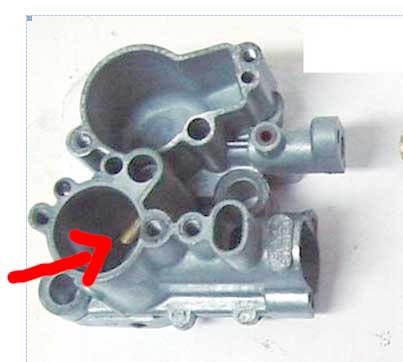 ho aperto il carburatore ed ho notato che a rubinetto aperto ed a motore spento dall'ugello indicato in rosso continuano a venir fuori gocce di benza...