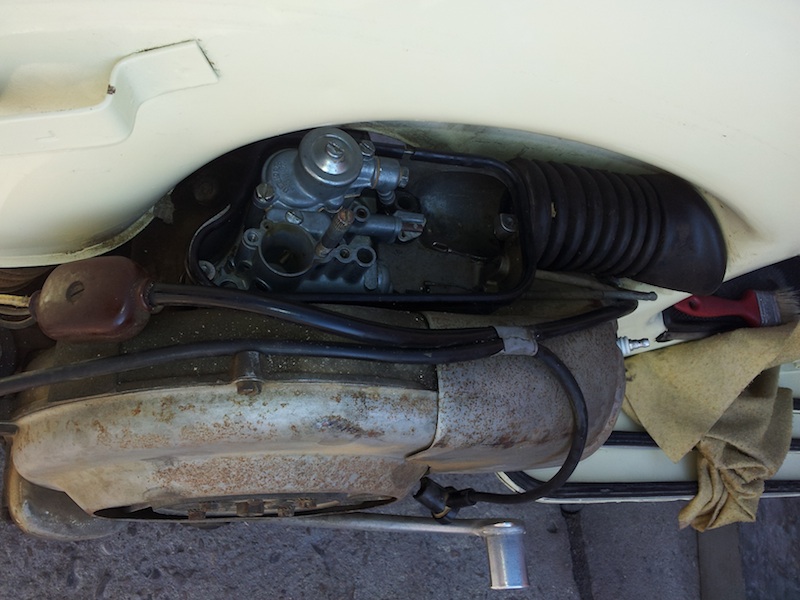 pulizia del carburatore....il grande Davide (ieri era il compleanno) l'ha smontato, ripulito, cambiato guarnizioni, rubinetto carburante, tubo benzina -.....ma non è partita. Dopo vari controlli cambia la bobbina e vvrrrooommm....PARTITA!! Ora ordinato ammortizzatore posteriore....da mettere a posto quello anteriore ma...qui lascio la parola a Davide e ci sposteremo nella parte restauro....che avverrà nel prossimo anno. Per ora la avvieremo per poter essere utilizzata e passare la revisione. Quanto ci sarà la disponibilità la restaureremo da cima a fondo ;)..suggerimenti?