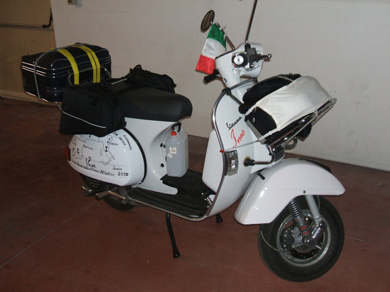 Beh, a grande richiesta ve la mostro, la potete vedere in questa foto per me emblematica, scattata la sera prima di partire per la Spagna... E' una normale PX 150 del 2006 scatalizzata con un Polini 177 montato P&P e getti aggiornati, che a opinion dei vari forum sarebbe la soluzione peggiore da usare e che sulla carta avrebbe dovuto grippare già da spentaiin garage. Ma nel mio caso mi ha permesso di fare 46000 km senza scaldate, senza grippate, senza aprire campane frizioni, senza cambiare pistoni o fasce, senza disincrostare, senza sfondare cuscinetti eccetera eccetera. Non ho neppure mai pulito il carburatore e ho sostituito i dischi frizione a 42000 prima di affrontare la Grecia in due a bordo con bagagli in piena estate... Allo stato attuale il motore arriva ancora a 110 orari di strumento e canta che è un piacere e il prossimo giugno dovrebbe sciropparsi un'altro viaggio abbastanza impegnativo in Gran Bretagna. Ora stop che per un topic di presentazione sono già in pieno OT  A proposito, la mia vespa si chiama Ines ... Immagine: