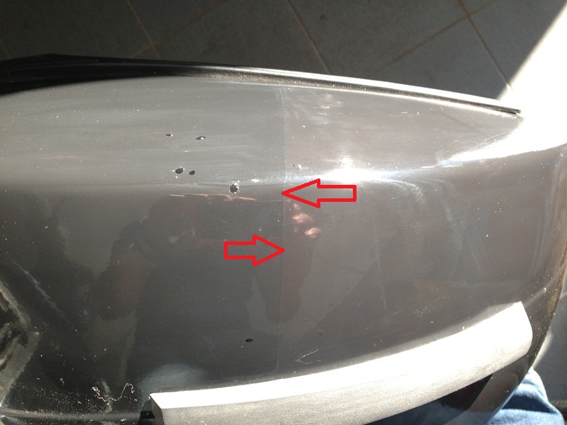 Ecco i motivi……… Notare le frecce rosse per capire lo “splendido lavoro” che il rincoglionito di turno ha fatto sul parafango anteriore. Simpatici anche i ritocchi fatti con una vernice “molto simile” a quella originale. Sottolineo che il suo colore è quello che in foto rimane a sinistra.
