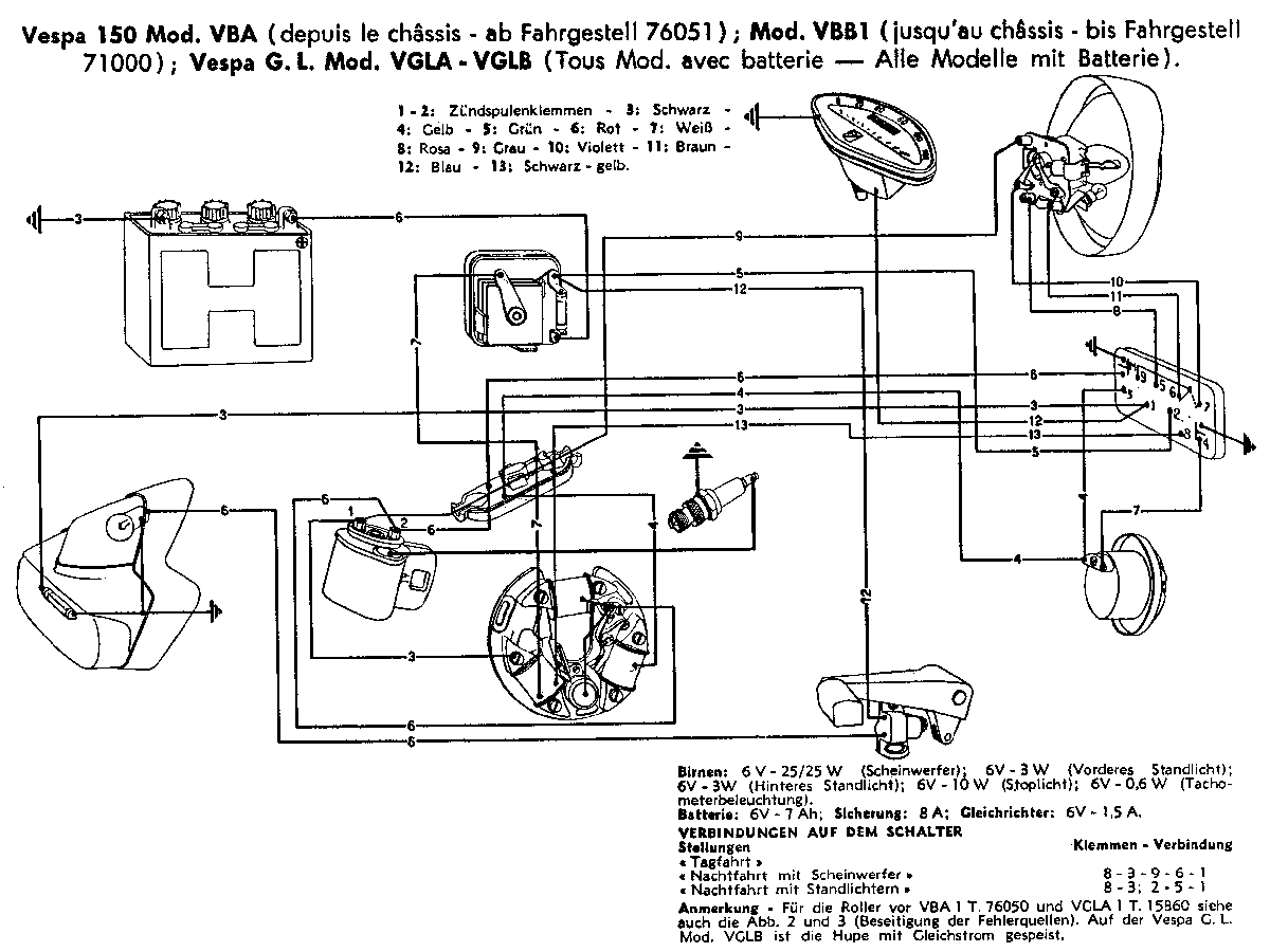 Luce abbagliante 6V / 25W Posizione ant. 6V / 3W Posizione Pos. 6V / 3W Stop 6V / 10W Luce Tachimetro 6V /0,6W Batteria 6V - 7Ah Raddrizzatore 6V - 1,5A