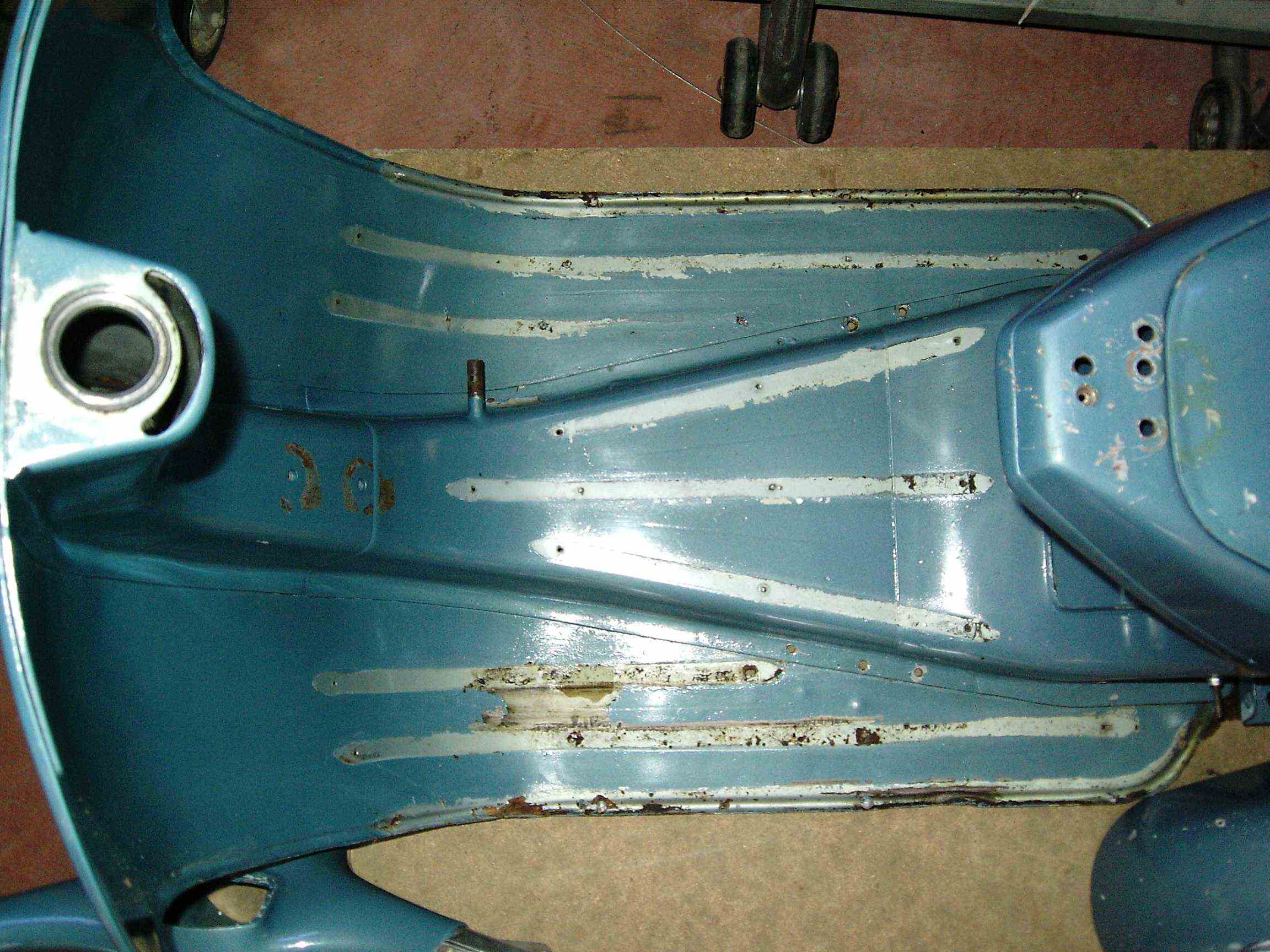 Il telaio è stato riverniciato circa 15 anni fa, purtroppo con un colore che non sembra essere l'originale, ma è comunque in buono stato generale ( a parte sulle liste pedana dove non hanno avuto la cortezza di rimuoverle prima della verniciatura) e l'idea era quella di mantenere questa verniciatura, andandola a riprendere solo nei punti necessari, lasciando alla vespa un aspetto antico...