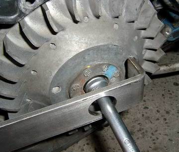 presumo tu abbia un volano vecchio tipo con il seeger beh per tenere fermo il volano o ti costruisci un blocca pistone con una vecchia candela(però prima di usarlo devi prima proteggere bene il cielo del pistone) altrimenti io mi ero costruito una chiave con un foro in mezzo che si potesse inserire nel foro a fagiolo predente nel volano.