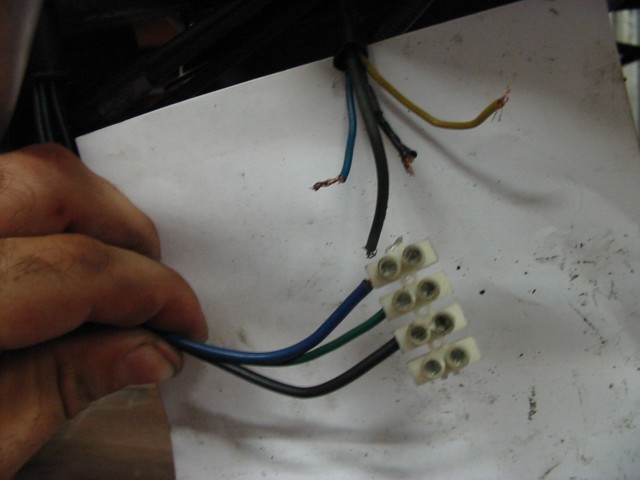Dallo statore escono 3 cavi che vanno alla bobina, bianco,verde,rosso e altri 3 BLU-NERO e VERDE che vanno all'impianto. Ho constatato che nero e verde spengono la moto e che il blu ha i 12 Volts. Premesso questo vi dico che questi 3 fili, andrebbero collegati all'impianto con 4 fili uno blu, uno nero,uno verde e uno giallo.