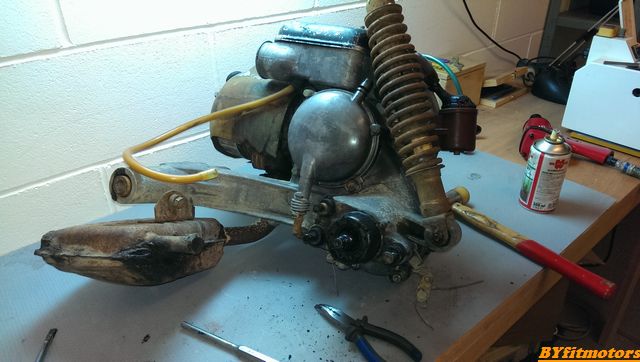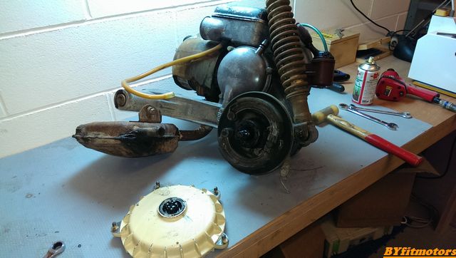 Via il tamburo del freno. Le molle elastiche che dovevano tener ferme le ganasce sono state sostituite da un giro di filo di rame annodato. Immagine: