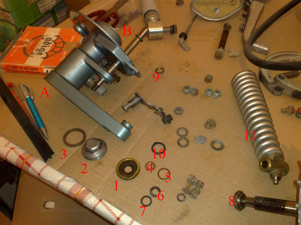 Sui lati A e B ho rimontato i cuscinetti, ma poi? Quale č la corretta sequenza per il rimontaggio dei componenti numerati? Manca qualcosa? Il numero 1 č un po' deformato, ma non lo trovo da nessuna aprte su internet. Il numero 4 č un rondella nuova visto che la 6 si č spezzata. Il numero 5 č un anello di rame Il numero 10 č un oring Il numero 9 č una rondella abbastanza spessa. 10, 5, 6, 7 andavano sul perno che ora č parzialmente infilato sul blocco verniciato, insieme alla molla 11, ma come?