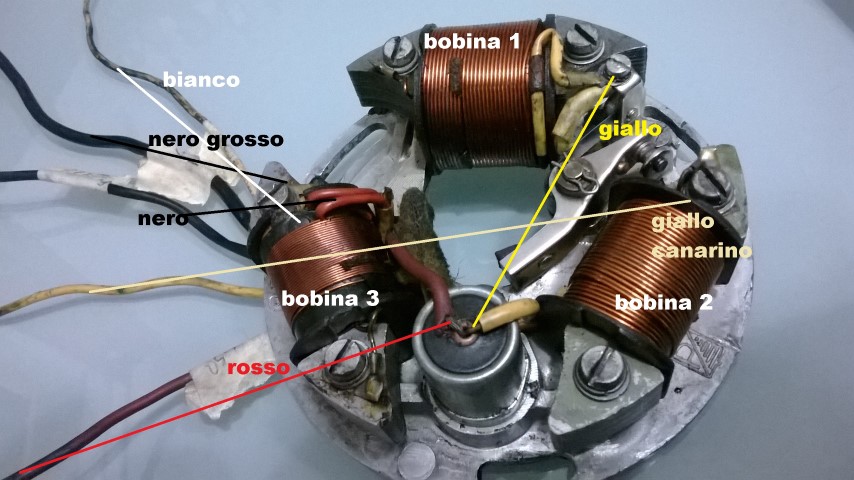 bobina 3: Da qui esce il filo nero ( l'unione dei due fili rossi che si vedono sulla bobina 3) e il filo bianco. Infine sempre sul terminale della bobina 3 accanto ai due fili rossi che si vedono in foto vi è collegato il filo nero grosso che, come ho già scritto, è avvitato direttamente alla vite che mantiene la bobina 3, quindi a massa.
