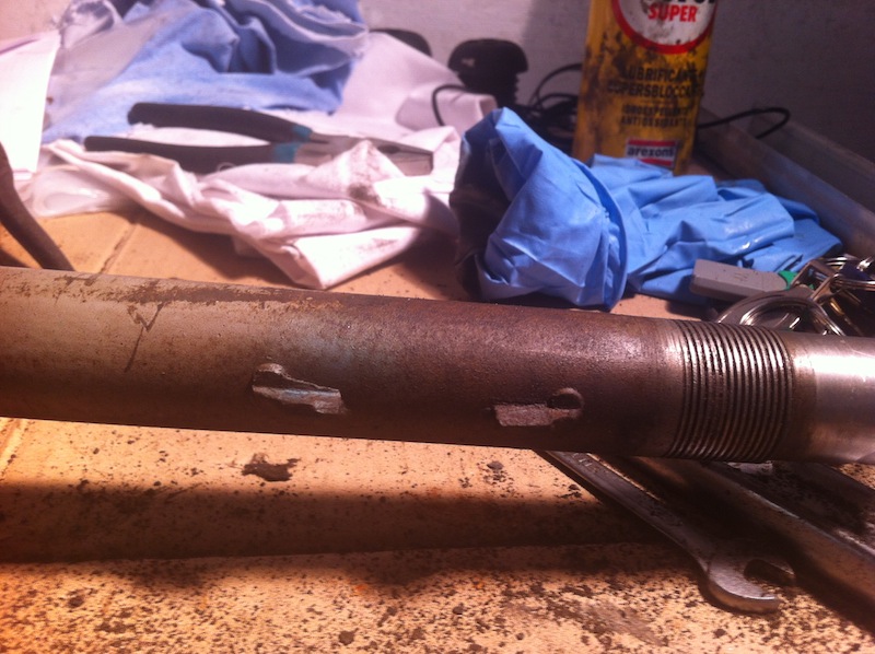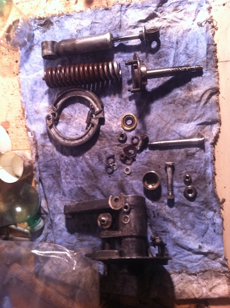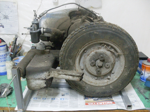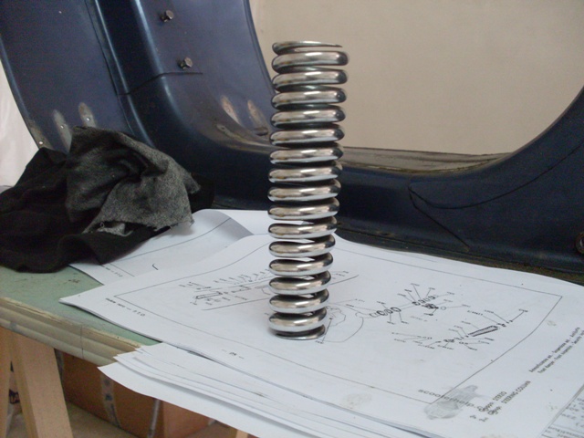 Per togliere il parafango devi prima liberara il tubo di sterzo dal cuscinetto inferiore e parapolvere. Se non l'hai mai fatto capovolgi il tubo, tieni fermo il parafango e batti piano sotto alla rondella parapolvere. Se ti fai aiutare è meglio, come sempre, ma non è indispensabile. Se sei bravo rovinerai solo un poco la rondella. Se sei molto bravo, dopo averla sfilata la raddrizzerai come nuova. Se sei scarso finisci che la spacchi e la ricompri nuova. Per finire di smontare l'ammo. posteriore una il sistema del dado e conntrodado per tenere fermo lo stelo mentre sviti il coperchio. Il diametro è di 9mm. In alternativa potresti usare un cacciavite a taglio ma fai più fatica e, se ti scappa, rovini l'intaglio dello stelo. L'ammortizzatore anteriore non è il suo originale. vedi te cosa fare quindi. A parte questo, tutto nel mozo è recuperabile. Cambia i cuscinetti ed il feltro parapolvere e poi controlla bene l'integrità del perno di ancoraggio tubo di sterzo al mozzo. A volte appare consumato. Recupera attentamente i rulli del perno mozzo. Procedi sempre con calma usando bene la testa perchè il rischio di fare danni è sempre in agguato. Non solo quando cercherai di aprire il contachilometri.