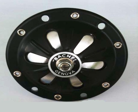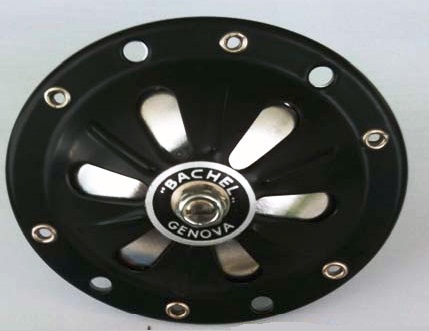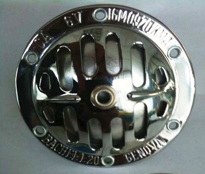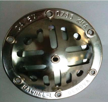 Codice Piaggio 070300 Clacson Bachel GENOVA, mascherina in ottone cromata, diametro 72 con 4 buchi per il fissaggio, 6VAC